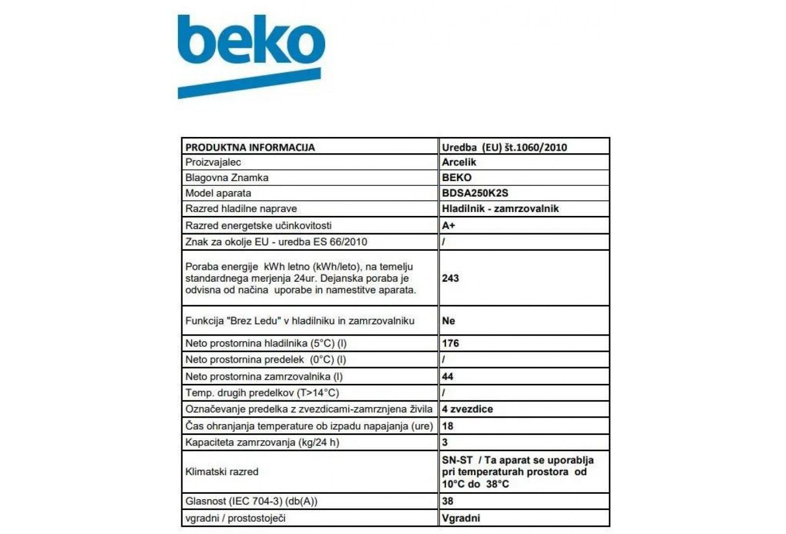 BEKO vgradni hladilnik BDSA250K2S – NOVO v ponudbi