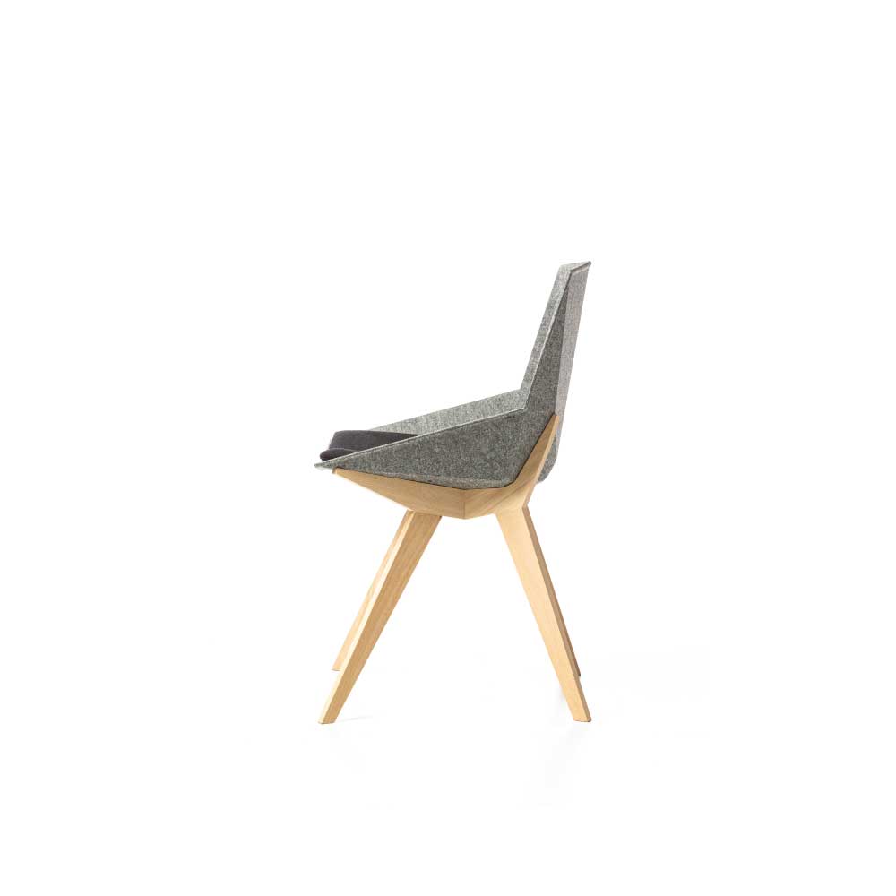 Lesene noge so obdelane z naravnim čebeljim voskom. Sedež sestavljajo ergonomske trikotne plošče iz recikliranega filca (70 % reciklirane plastične steklenice), ki omogočajo udobno sedenje s prilagajanjem telesu.