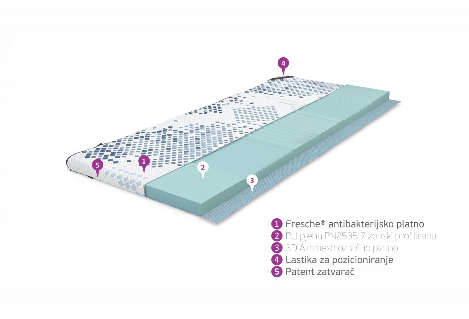 Udoben nadvložek z 5 consko profilacijo. Edinstven sistem podpore telesu z namenom razbremenitve stičnih točk za višjo raven udobja.