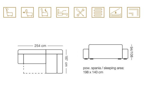 Celotna širina približno 254–257 cm, globina 187–192 cm, višina 94–108 cm (toleranca ± 5 cm)