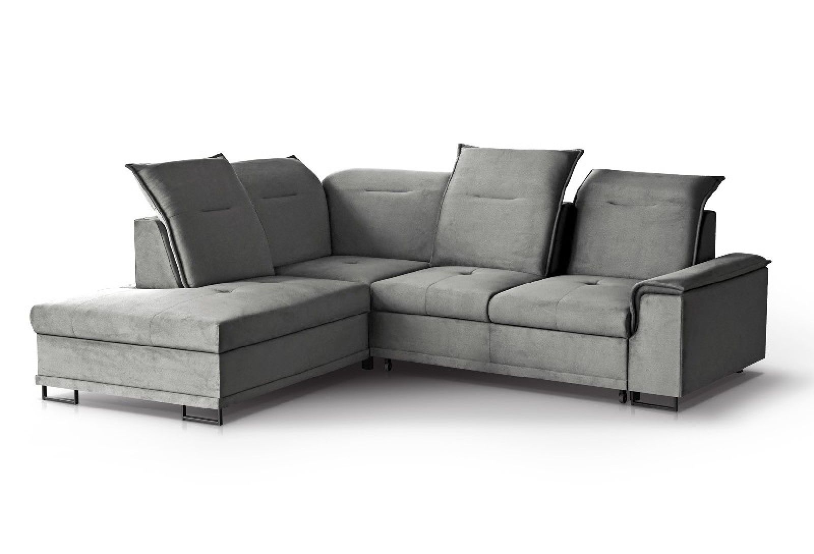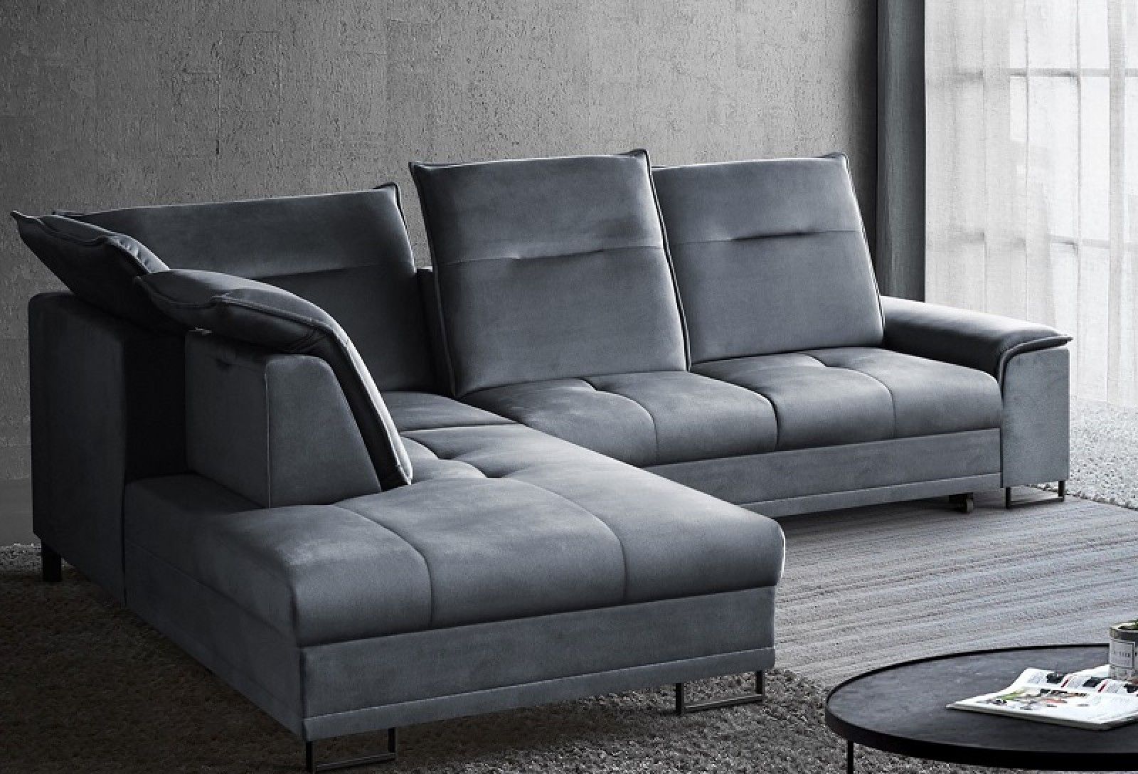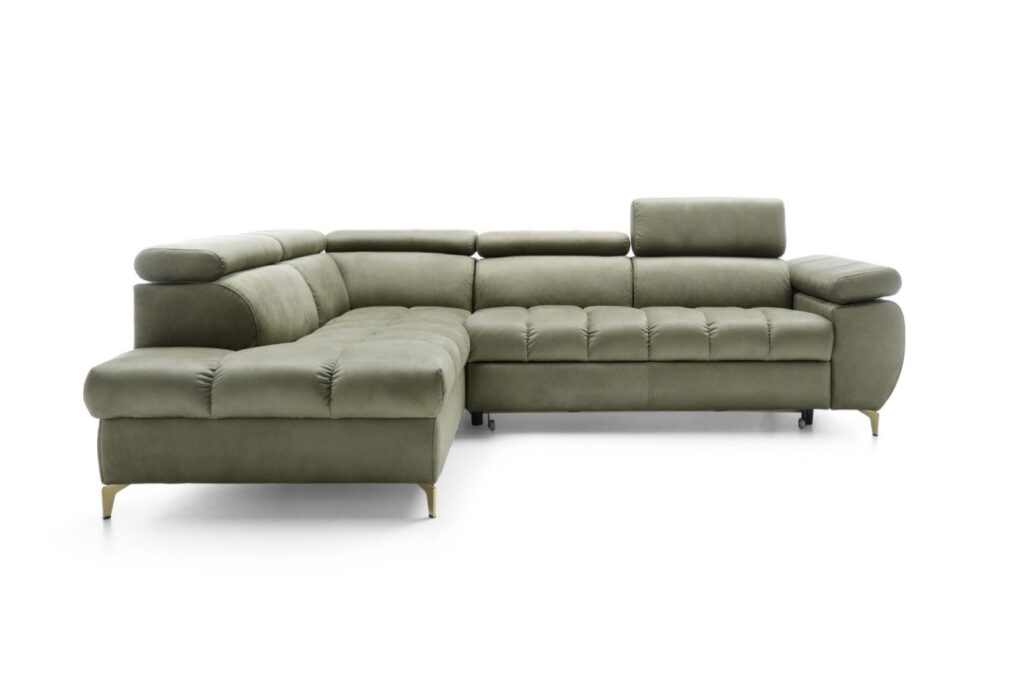 Bruno L je udobna kotna sedežna garnitura z možnostjo nastavitve vzglavnika in hrbtišča.