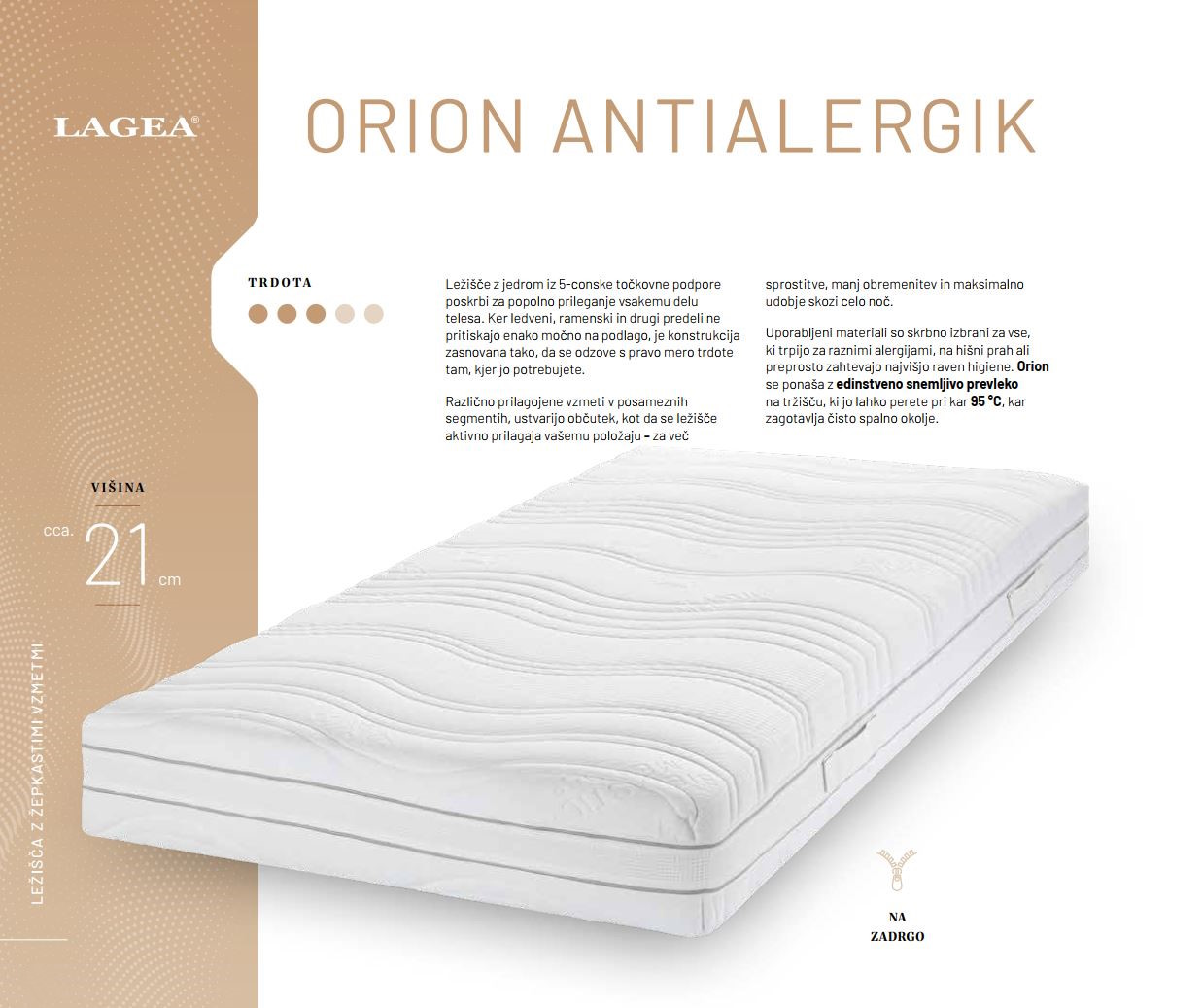 Uporabljeni materiali so skrbno izbrani za vse, ki trpijo za raznimi alergijami, na hišni prah ali preprosto zahtevajo najvišjo raven higiene. Orion se ponaša z edinstveno snemljivo prevleko na tržišču, ki jo lahko perete pri kar 95 °C, kar zagotavlja čisto spalno okolje.